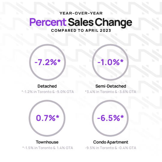 Greater Toronto Area (GTA) REALTORS® reported 7,114 sales through the Toronto Regional Real Estate Board (TRREB) MLS® System in April 2024 – down by five per cent compared to April 2023. New listings were up by 47.2 per cent over the same period. On a seasonally adjusted monthly basis, sales edged lower while new listings were up compared to March. Listings were up markedly in April in comparison to last year and last month. Many homeowners are anticipating an increase in demand for ownership housing as we move through the spring.